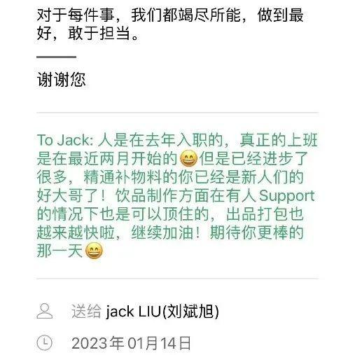 认知实习刚刚结束,非常感谢学院给予这次机会,也感谢星巴克的伙伴们及我的导师对我的悉心栽培,让我收获了不少东西。入职期间我也学会了如何用良好的态度面对顾客,耐心的出品,解决顾客的基本需求,制作标准的饮品。刚开始很容易手忙脚乱,但是伙伴们一句句的鼓励也让我慢慢成长。不断积累经验,最怕的就是不明白的东西不敢问,所以无论多小的问题,不懂的我都会主动询问,最后我也能快速高效的完成任务了。在点单的岗位上还是需要下功夫,客人一多就很容易分心,不过静下心来去做也是没问题的。时间从指缝悄悄溜走,一眨眼实习结束啦,后面的路还很长,我会继续努力!