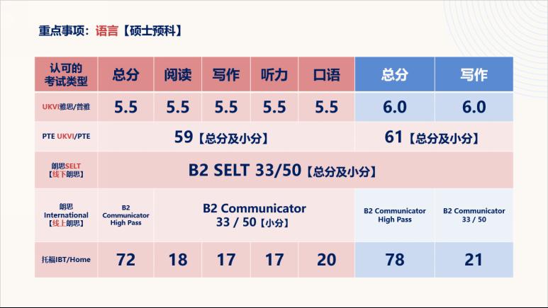 2. 雅思成绩需达到5.5(单项不低于5.5),接受多种语言考试,参考下图。