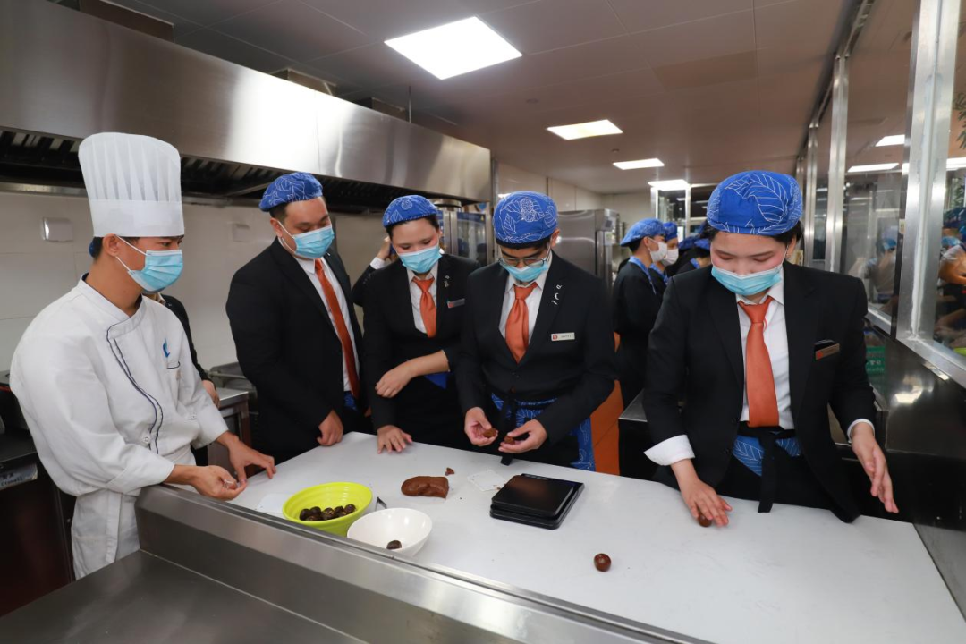 活动首站,泰国师生走进学院中式面点课堂,在专业教师指导下学习传统核桃酥制作。从调配油酥、塑形雕花到烘焙控温,学生们沉浸于中式点心的精细工艺中。一名泰国学生捧起亲手制作的核桃酥感叹:“这不仅是一次技能实践,更让我感受到中国饮食文化中‘以食为媒’的待客之道。”