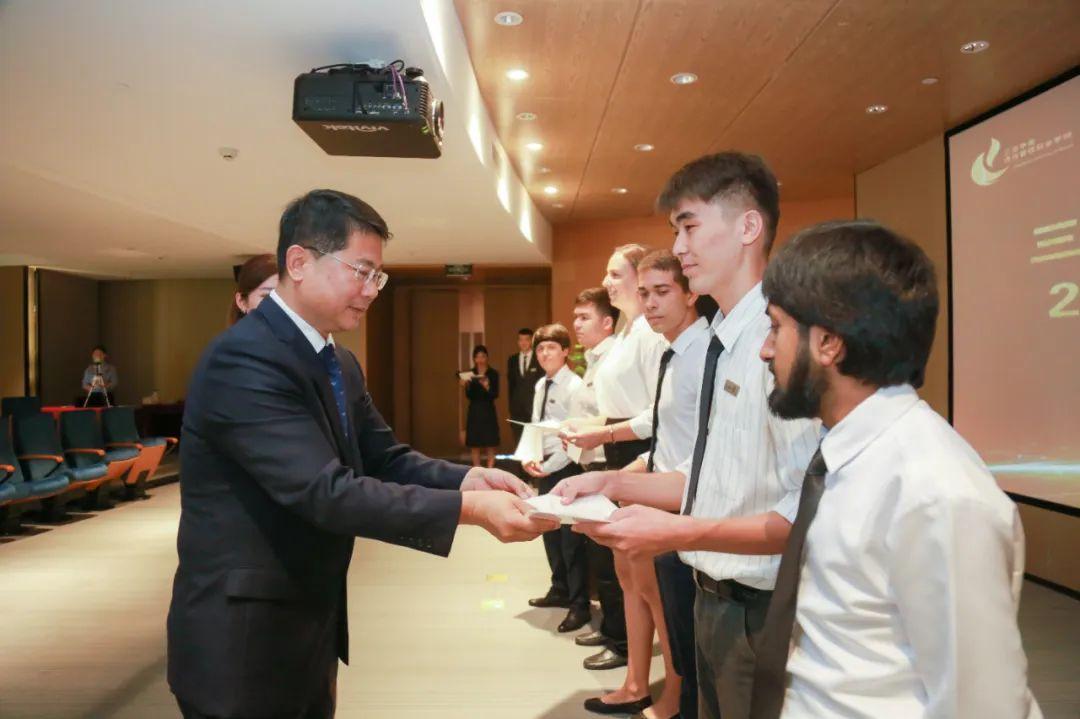 7月17日下午,三亚中瑞酒店管理职业学院2020届国际学生毕业典礼在学校小礼堂隆重举行,学院党委书记贾有维、院长房怀军、党委副书记苏珍菊、学院各系部负责人和教师代表参与出席。来自哈萨克斯坦、乌兹别克斯坦、俄罗斯等7个国家的70名毕业国际学生以线上线下的不同方式参加了本次典礼,让还在国外未能返校的学生能够一同见证这一激动的时刻。