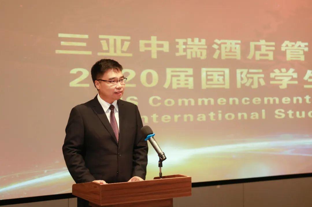 典礼开始,院长房怀军首先发表致辞,对圆满完成学业的2019级国际学生表示最热烈的祝贺,向一直以来倾心竭力、无私付出的老师们,致以最诚挚的感谢。2020年,受全球疫情的影响,国际学生与三亚中瑞共克时艰,度过了严峻时刻。今日,各位国际学子顺利完成学业,希望他们都能践行三亚中瑞“知行合一、学以致用”的校训,将这一年学到的知识和文化运用到你们未来的生活和工作中去,为自己的国家与和世界做出自己的贡献。