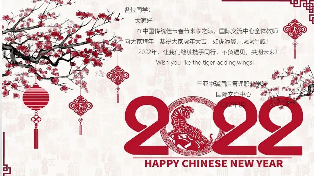 2022年虎年春节来临之际,为了让国际学生深入了解独具中华民族特色的春节习俗,体验丰富多彩的中华传统文化,三亚中瑞国际交流中心全体师生开展线上线下“迎新春、过大年”主题活动。