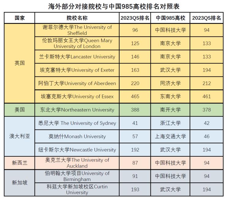五、部分对接海外院校与国内985院校对照表