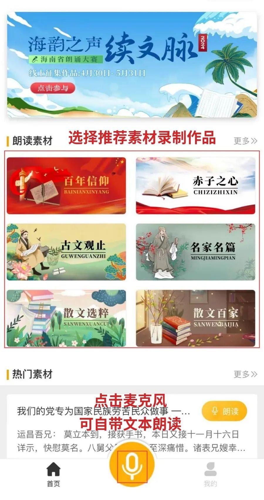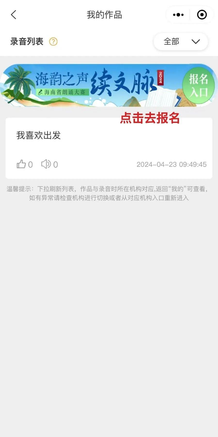 第二步:点击底部“我的-我的作品”,点击活动通栏图进入,勾选已录制好的参赛作品并填写相关信息,提交即可。