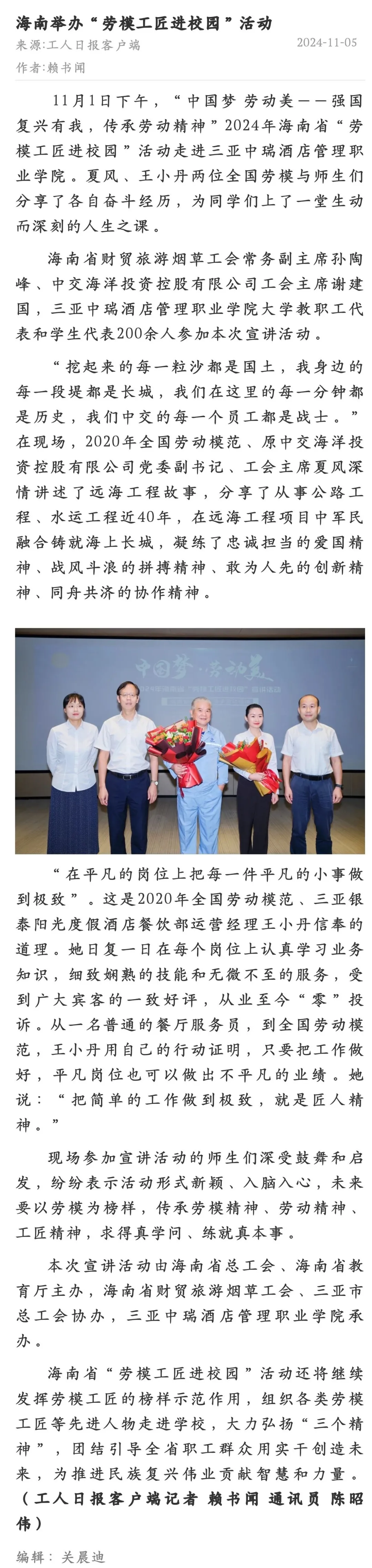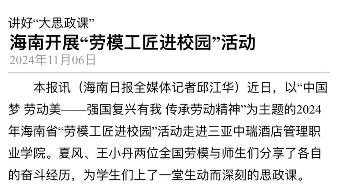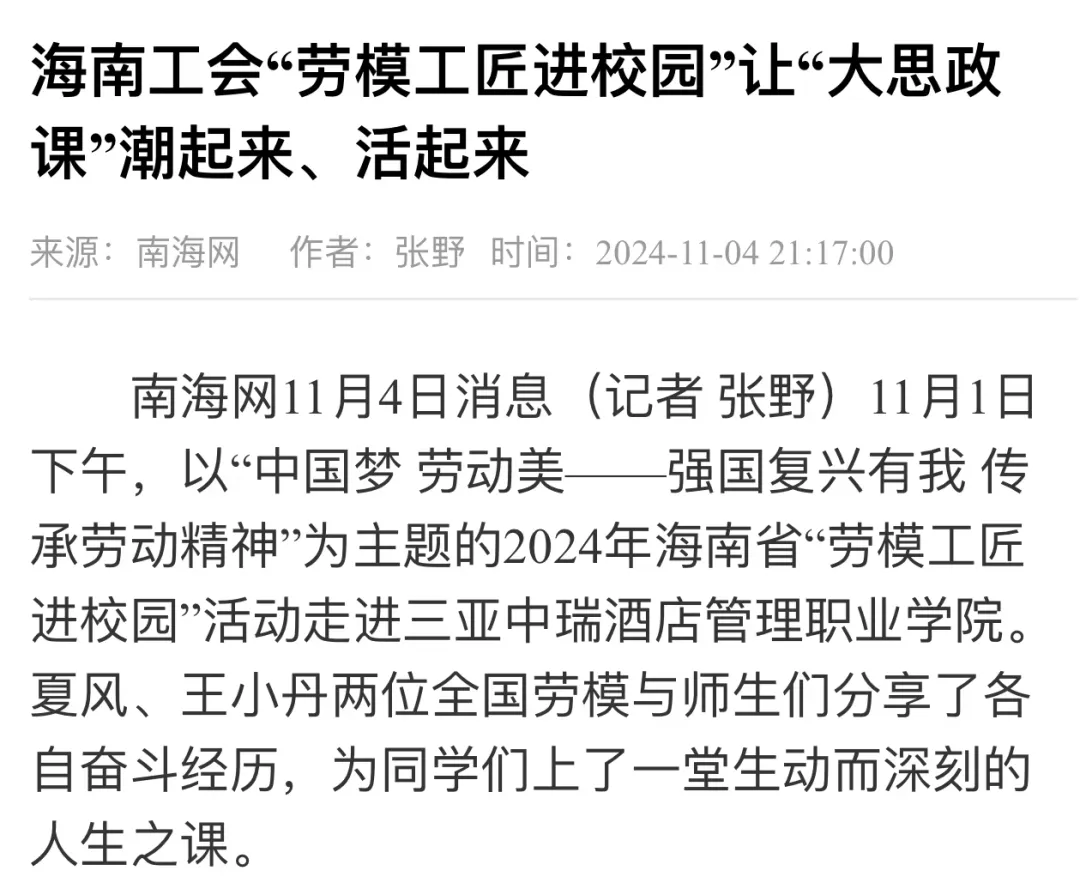 媒体聚焦 | 工人日报等多家媒体关注报道在三亚中瑞举办的海南省“劳模工匠进校园”活动
