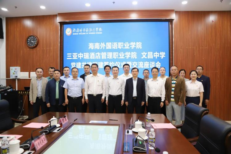 为扎实推进省委教育工委关于开展教育系统党建共建联建工作要求,构建校际协同、深度融合的党建新格局,12月2日下午,在海南外国语职业学院举行党建共建联建签约仪式暨交流座谈会。海南外国语职业学院党委书记陈正强,海南外国语职业学院党委委员、副校长苑德宇,我院党委书记(政府督导专员)、理事长贾有维,文昌中学党委书记段华松,以及联建单位党务干部代表参会。
