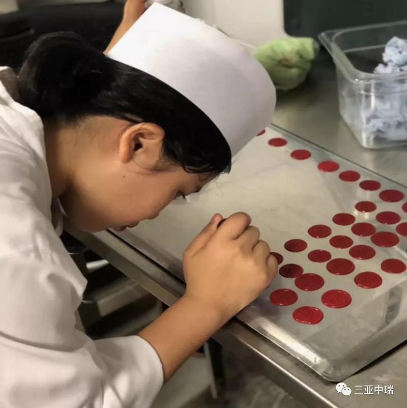 在后厨实习的黄信琳同学正在专注的制作巧克力