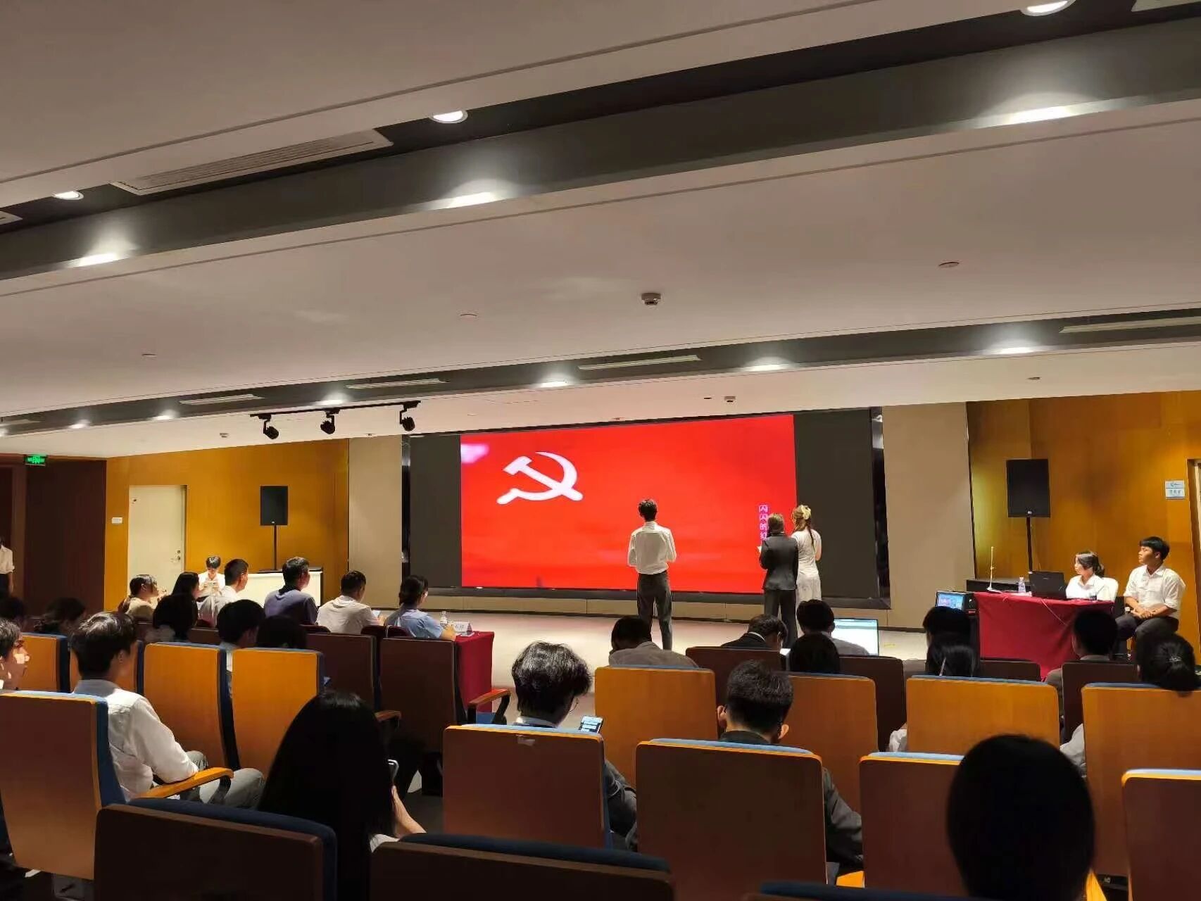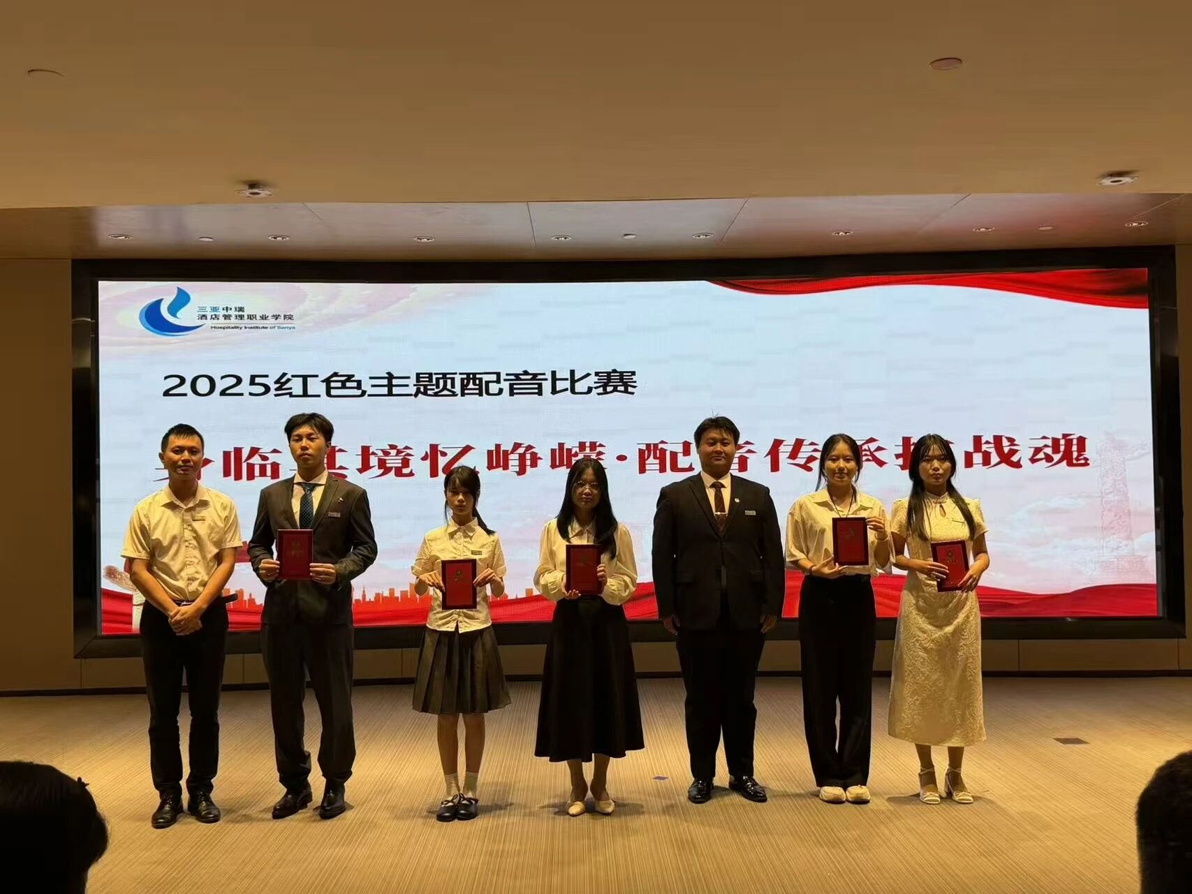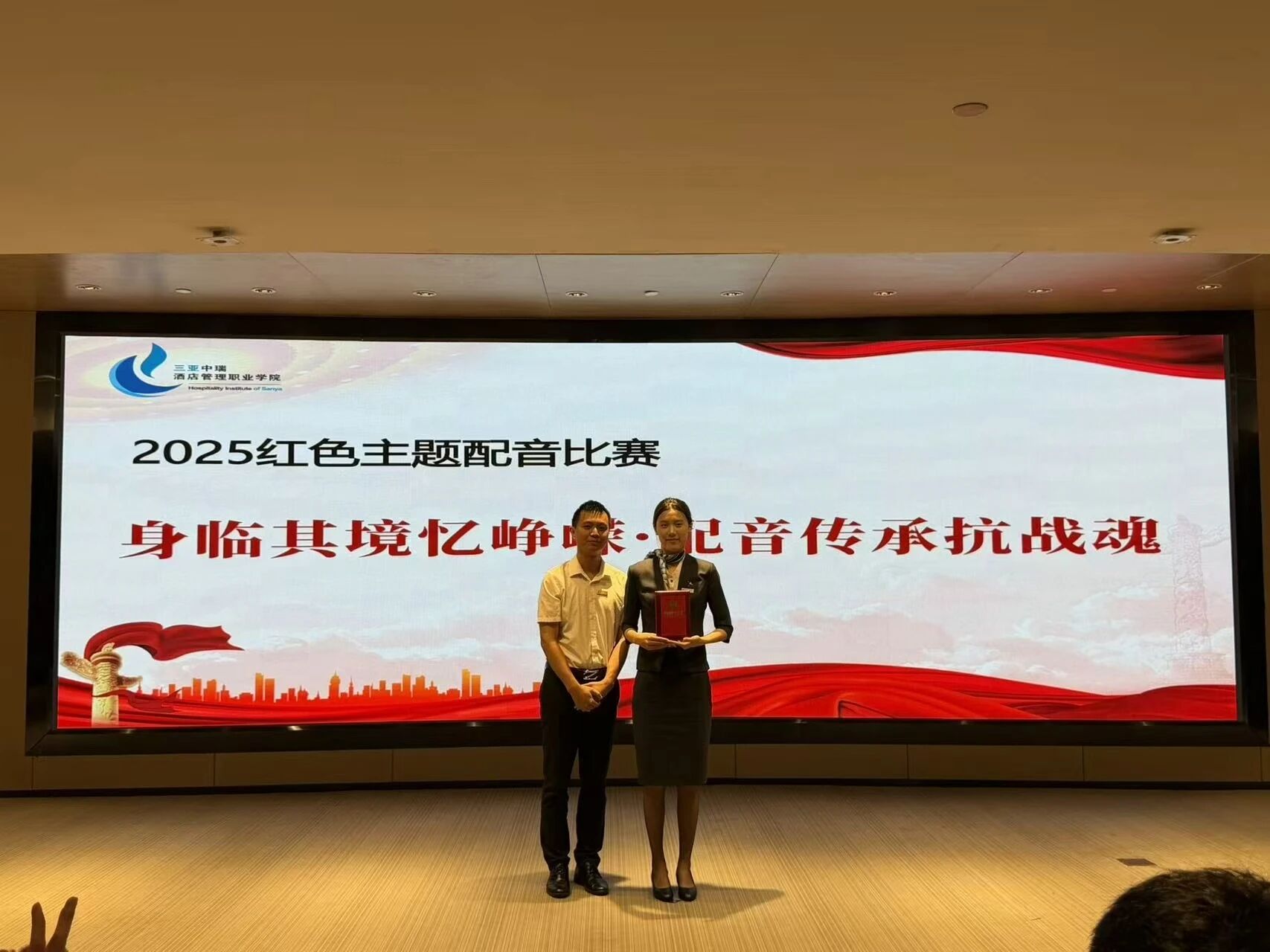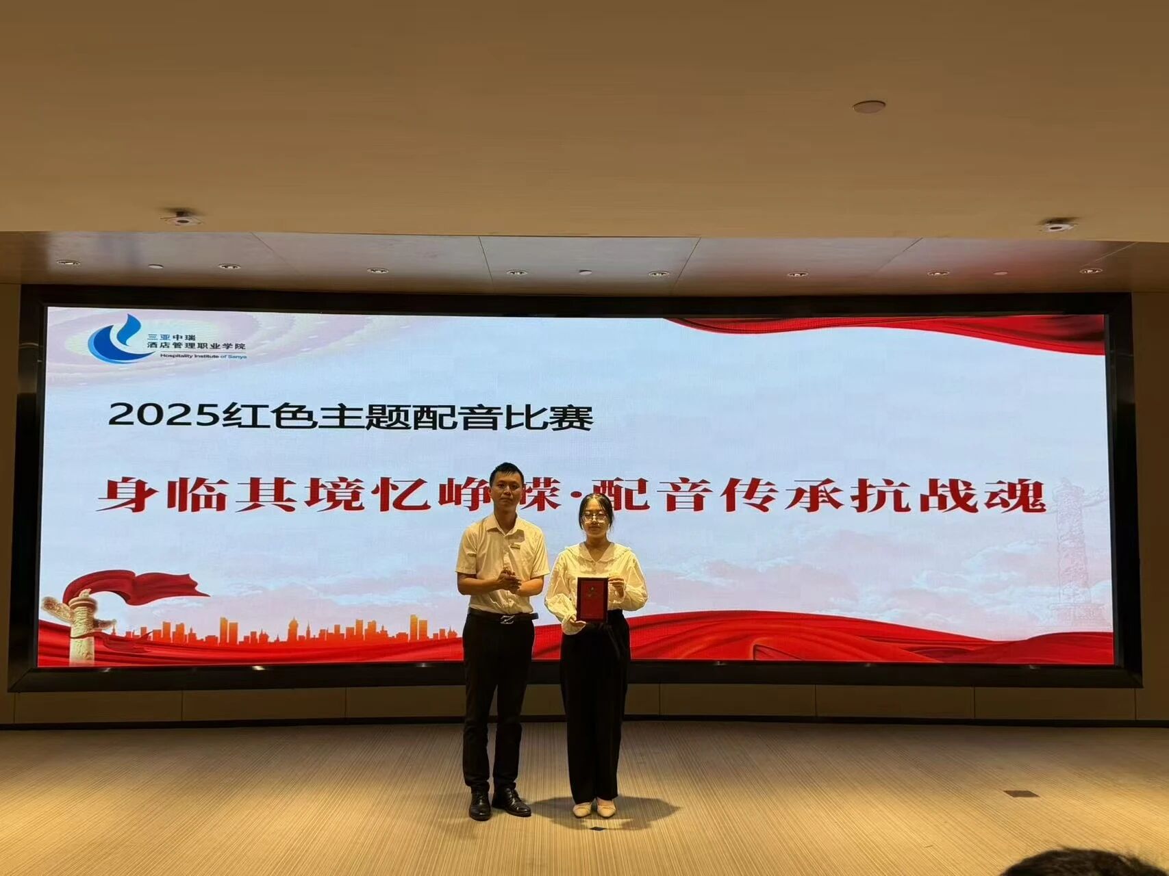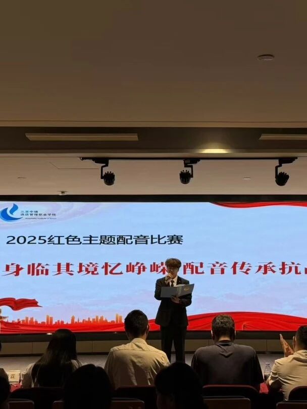 2025年9月24日晚,三亚中瑞酒店管理职业学院团委在综合楼小礼堂举办“声临其境忆峥嵘,配音传承抗战魂”红色主题配音比赛。本次活动作为纪念中国人民抗日战争暨世界反法西斯战争胜利80周年系列活动的重要组成部分,旨在通过配音艺术形式引导青年学生重温红色历史、传承抗战精神,进一步增强民族认同感与时代责任感。
