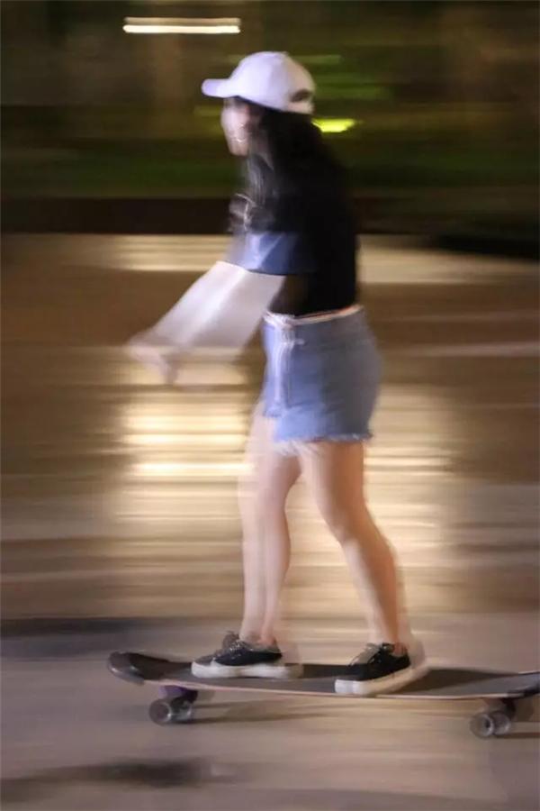 踩着长板短板用倾斜的方式改变着滑板的滑行轨迹,上臂时刻保持的平衡,使其运转自如。
